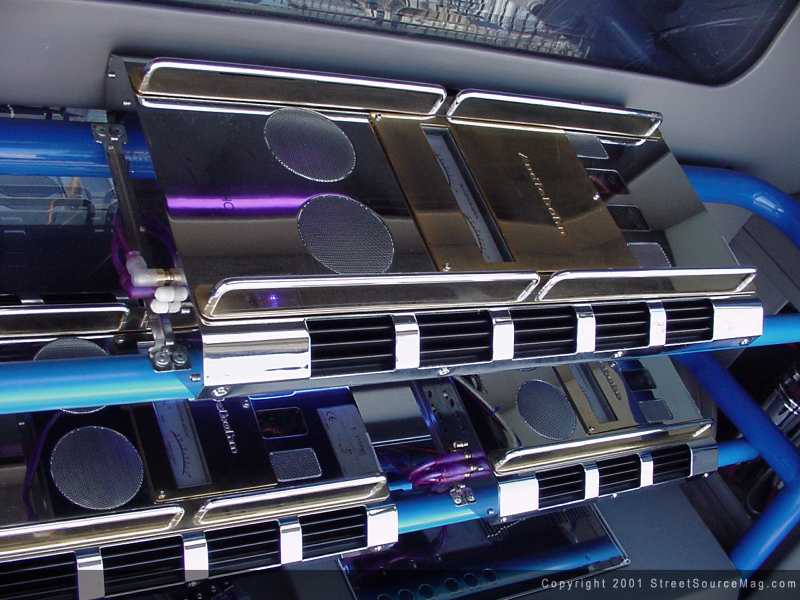 To finish off the interior, Trent had a roll cage made by Ruben and Drew of Monkeybars. The full roll cage was powder coated blue for added looks. Finally, to finish off the modifications to the interior, Trent was now ready to work on the audio and video of his Explorer. A Clarion double din MAX2256 CD and cassette player with monitor, along with a Clarion 6-disc changer, was used as the starting point. Trent then went with an Audiobahn 30 band EQ to help balance the sound throughout the Explorer. Three Audiobahn amplifiers were used to push the sound through the series of speakers. One was used for the six 12-inch Audiobahn Aluminum subs, one for the mid-bass in the front doors and the final one is a four channel, used to help the high end. All of the mids and highs are mounted in kick panels amongst the door panels and floor. To help bring out the bass, an Audiobahn bass booster was installed.