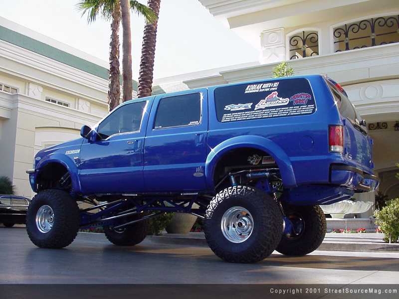 To change the overall appearance of this monsterous Excursion, John changed many things. Starting with the front, John went with a Trenz billet grille. Next, John took the stock front bumper, smoothed it out and frenched in a set of PIAA lights. To help the mean off road look of his ride, a Reaper Racing Banshee light bar was installed. To provide a clean look, Auto Indulgence super whites where installed.  Working his way back to the rear, a set of Bush Walker fender flares where mounted up.