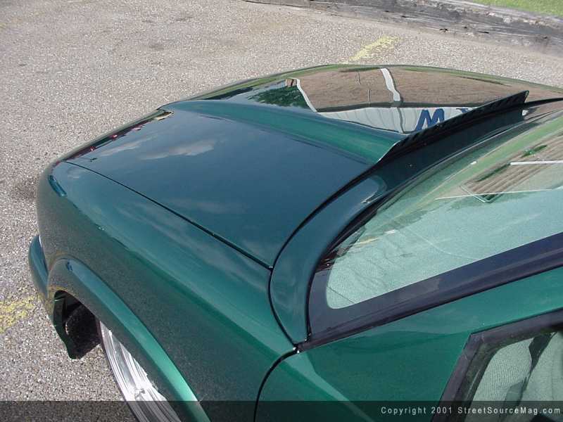 Next, the 3rd brake light, outside mirrors, cab seams and door handles were removed from the truck for an overall smooth look.  Up front, the wiper cowl, wipers, antenna, washer squirters, license plate holes and turn signals were shaved, and the stock hood was replaced with a 2 ½" Reflexxion cowl hood.