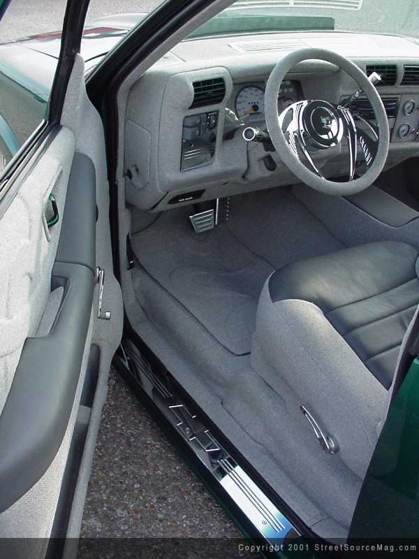 Brandon McDonald of Lebanon, Tennessee went to work giving Jason's interior a completely new look. First, Brandon removed the dash and rewrapped it in gray tweed and then reinstalled it before removing the headliner, door panels, and all other interior panels and rewrapping them in gray tweed and leather. Brandon next removed the factory seats, removed the headrests and rewrapped them in gray tweed. Brandon also installed a set of APC white face gauges, billet oval rearview mirror, and capped it off with a Psycho steering wheel from Billet Specialties.