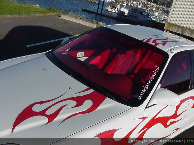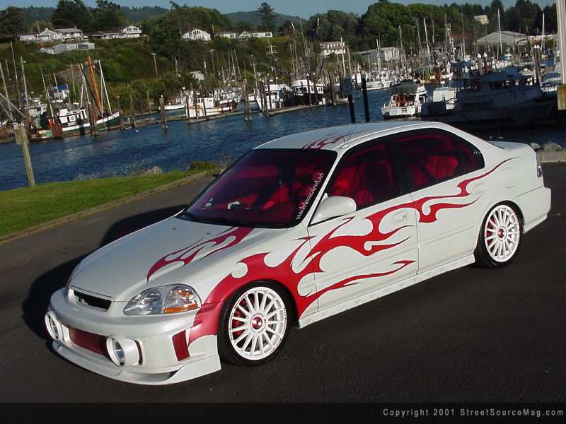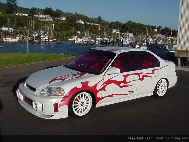 To highlight the colors used through out the car, Angie had made up her mind in having red window tint. After working over some minor exterior items and being happy with the completion, it was time to pick out the paint that would accompany the civic. Angie had made the decision to stick with a white and red theme from inside out. With help from Doug and Ben, Gabe began spraying down red pearl through out the already white paint.