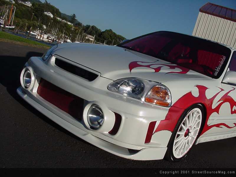 Having the 1997 4-door civic now on hand, it was time to start working the exterior items to there liking. Beginning with the front clip, the stock Honda bumper was ditched and replaced with an EVO 1 giving the car a much meaner European look moving down the road. With replacing the headlights with Hyper-white bulbs, the tail lights where also replaced by a set of Euro clears along with a new set of emblems to bring out a much cleaner look.