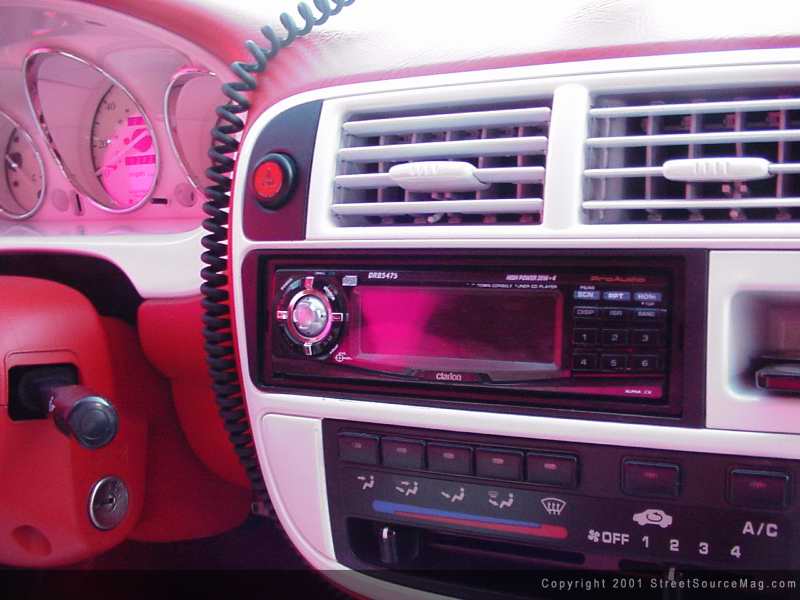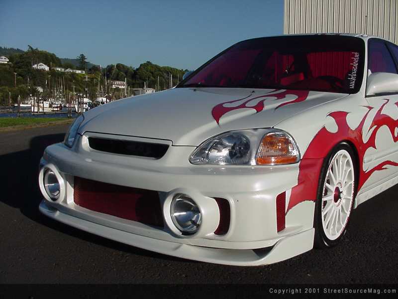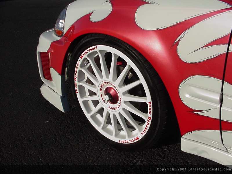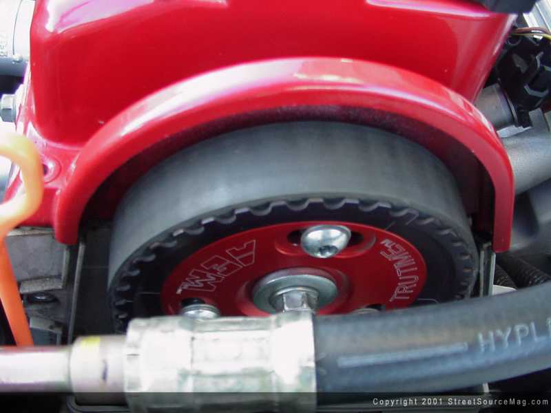 Now having the car just about complete, the two decided that being an import and all they would need to put a little work into the engine bay. For starters the plug wires where ditched for a set from MSD. To help the engine spool up for better performance, an AEM Cam Gear along with AEM pulleys where installed. Helping the engine breathe with the new additions, a DC sport ceramic header with 3" custom exhaust would be installed topped with a polished Can muffler.