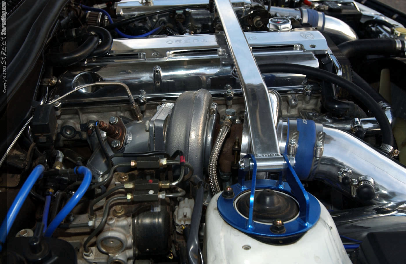 One of the first items at hand would be the current stance and shoes equipped on the Supra. So to take care of these problems the stock suspension was removed and replaced with a set of Eibach springs to bring about a more aggressive look. Next the stock shoes would be set aside for another day and replaced with a set of 18 inch Niche wheels wrapped in 245-35 Nitto 555's.   With the lower stance and new shoes, cornering would be much improved but Ian still decided to install a polished strut bar under the hood to help tighten things up.