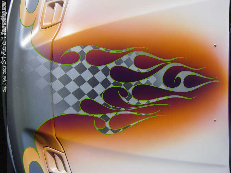 all trimmed in green hand painted pin striping. The graphics are wrap into the doorjambs to make the paint job a perfect one.   All the paint used was House of Kolor and was laid out by Randy Leonard from Dallas, NC. Rick Woods from Clover, SC is responsible for all the bodywork and prep before the paint could be laid. Summer also swapped out the factory taillights in favor of a set of euro clears as well as installed a set of clear front turn signals.