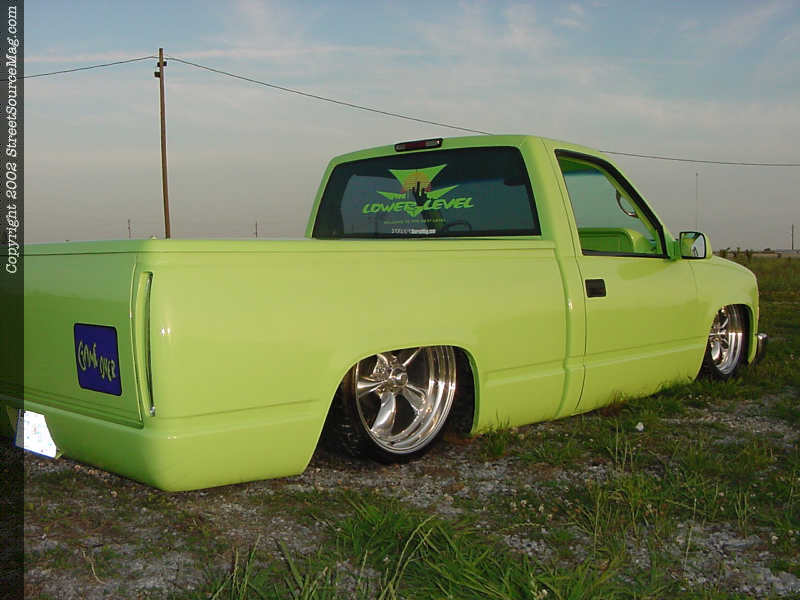 For other exterior changes Patrick Cordell took over and shaved the tailgate handle, molded the roll pan and bolted up a set of Cadillac tail lights.  When the body work was exactly the way Ramiro wanted it, with the help of Patrick, they layed down the eye catching Shrek Green you see before you everywhere they possibly could.