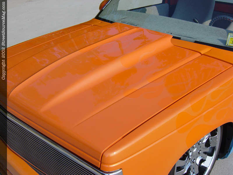 In order to stand out in a show field, the first thing you've got to have is an exterior that will catch everyone's eye. Mark has achieved this with his choice of bright colors and paint scheme. Before any of the paint was chosen, there were a few body mods and additions that were performed. The door handles, wiper cowl, emblems and taillights were all shaved.