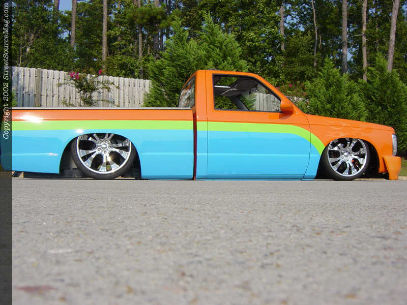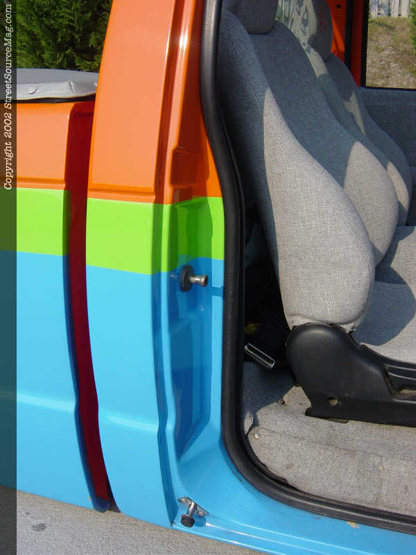 Now that bodywork was finished, which was all done by Mike and Steve Jolly from Faith, NC, it was time to lay down a few colors to make the truck an eye catcher. Steve Jolly takes the credit for laying down the PPG bright orange base with Porsche blue and lime green accents.  The full color scheme carries into the doorjambs for a perfect paint job. After finishing the paint job and putting it all back together, Mark still thought it was missing something.