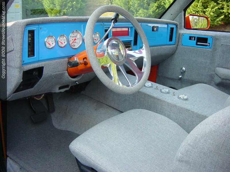 That something was a set of orange pearl ghost flames. After having Mark Tucker tape them out, Steve once again handled the gun work and finishing. Knowing that a flawless exterior alone will never win at shows, Mark has built the interior to hang with the exterior. The factory dash was pulled out and wrapped with gray tweed and had a custom gauge cluster built with Auto Meter gauges.