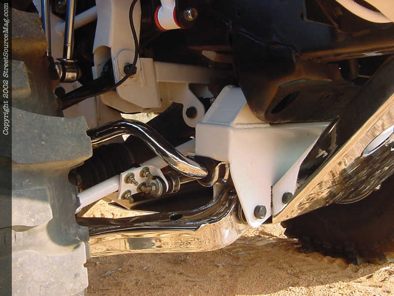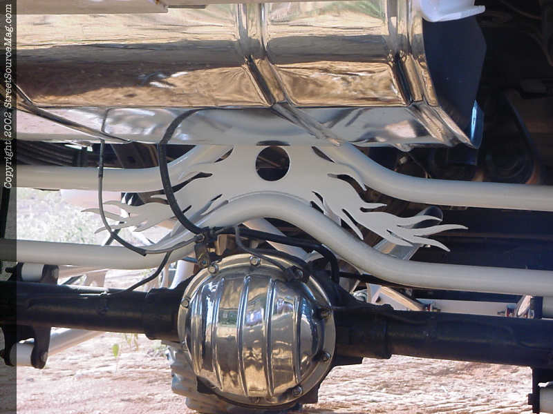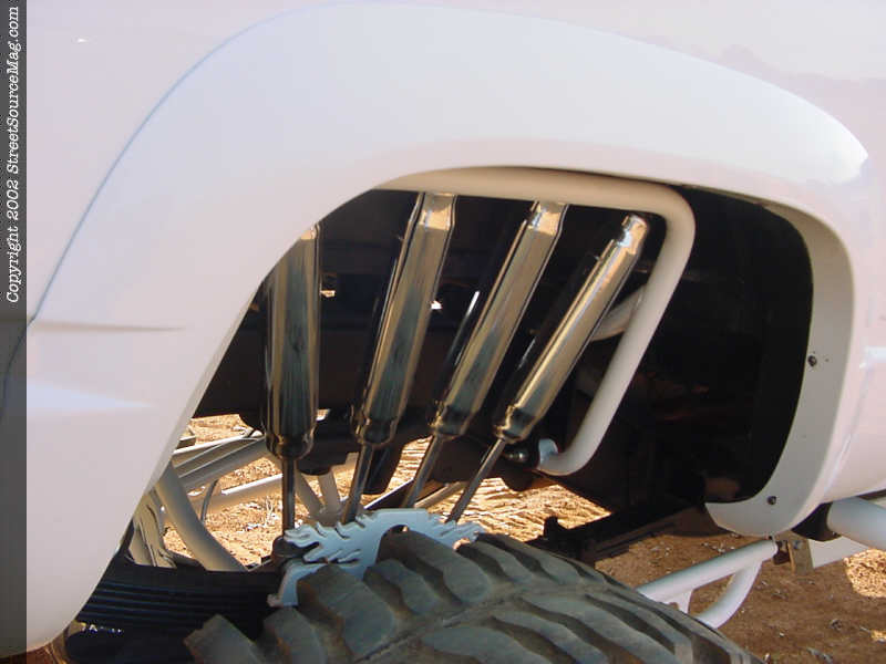 Knowing that low wasn't his preference, Chase decided to lift things instead. With a 12-inch Shiplash suspension lift and a 3-inch body lift, things would be looking up. Next to the suspension goodies would be a custom built set of flame traction bars along with4 custom-built rear blocks supplied with custom shock hoops. With the hoops in place, a set of Pro Comp shocks would be bolted up rear and front.