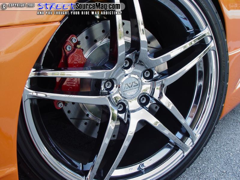 With the body aerodynamics in place it was time to change up the paint. The main color of choice Neil would go with would be a Dupont paint of candy orange. To get the correct color needed it would take 1 base coat of white, 4 coats of orange with 2 coats of clear. The roof would then be painted Black.   With the paint applied there was one item needed to help set it off. For that Neil would bolt on a set of Advan Model 5 Original Design Twin 5 Spoke (Bright Chrome) wheels.