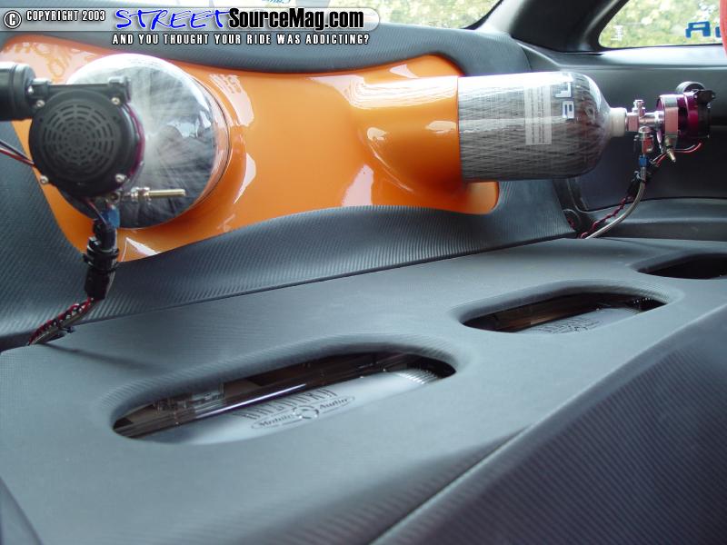 Finishing off the interior before the audio is installed, the back deck would be found customized featuring Mad Carbon Leather and custom made speaker pods along with the back wall being fabricated to feature 2 Nitrous Express carbon fiber bottles with bottle openers molded and trimmed out with Mad Carbon Leather. A set of Nismo s15 floor mats finish off the vision.