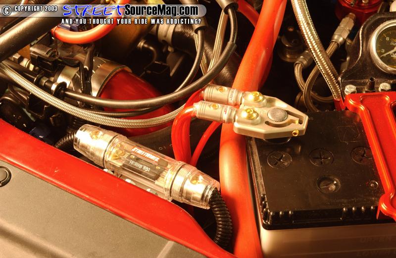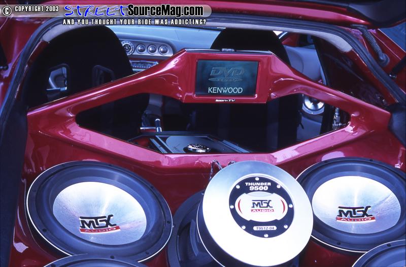 Like any other intense system there are some necessities that are very important. First they would lay down Noise Killer Extreme sound damping mat inside and out along with the rear hatch area. Wiring of the system would be done using Streetwires 12 gauge blue and silver twisted pair speaker cable throughout Streetwires ZN6 series RCA cables were run throughout as well. SVR 33 battery was installed under the hood and 4 SVR 33's were placed behind the side panels to the left and right of the amp rack with their terminals sticking out through the panel to display the Streetwires battery terminals and power wire coming off the batteries.