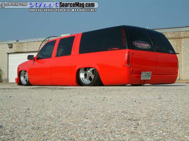 Jon started by calling his old friends Dacy Jackson and Brett Cox to get them sold on the idea that the Burban could be dragging body in as little as 10 days. So with them on board they began by taking the stock Burban that Jon had purchased from his mom and removing the entire front suspension. The factory coils were replaced with new Slam Specialties RS-72 bags. The factory spindles were then replaced with a drop spindle from Chassis Tech. Next they added a Monroe shock to the front to keep the ride as smooth at all times. Out back it was decided upon to cut the frame rails in favor of a C -notch to allow the frame and rearend to never have the ability to touch. The rear leafs were ditched in favor of a 2 link set up with a track bar installed to keep the rearend from shifting under extreme cornering. Another set of Slam Specialties RS-72's were installed in the rear to ensure plenty of lift. To ensure that the gas tank never had a chance to touch the ground Jon used the 20 Gallon donor of a Blazer, after it was powder coated to prevent it from rusting, and make it look better of course. To supply the pneumatic pressure the Burban needed to get things moving, (2) Viar 450 compressors were plumbed thru a 7-gallon tank. For that quick on the fly vertical motion Jon decided to install (8) GC Valves for individual corner control at all times.