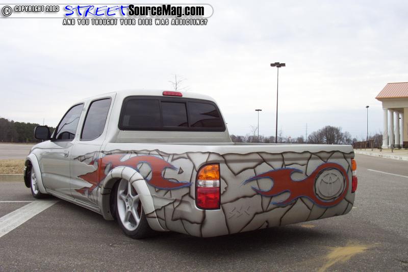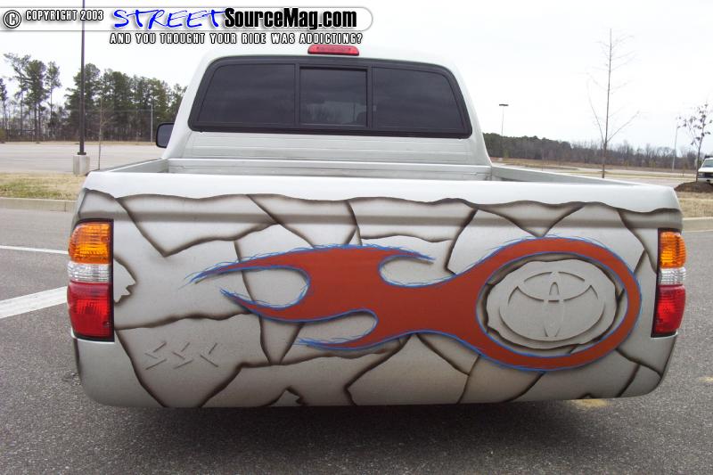 Now that the truck had made a total 180 in life, going from a once Taco Pre-runner into what now is a frame railing lower then life Mini, it was time to approach the next phase of the build up. Clyde turned his new creation over to the attention of SSC's paint guru William Stacks. Williams's first chore was to clean up the factory body and make the truck look custom. William took and shaved the back doors of their handles along with completely molding the tailgate into the body of the truck making it a permanent fixture.