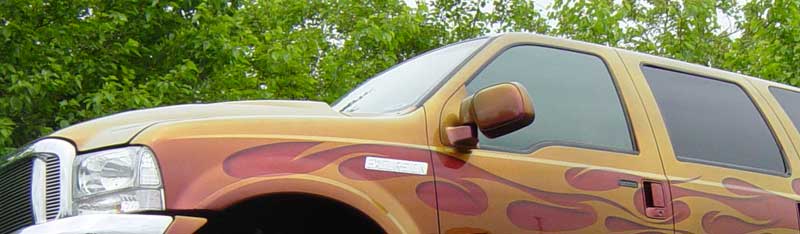 When it comes to finding time outside of work to build a custom, most people run short. That's not the case for Paul Price from Haymarket, Virginia. Paul happens to own and run Unlimited Auto Body and not only does crash repairs, but also does custom work for customers. When the day is over and the "paying customers" cars are put away, its time to tinker on his own project, a 2000 Ford Excursion. Most people would think that it's a good thing to have your own body shop, but it also makes for long days due to the fact that you personal vehicle has to wait till after hours in order to pay the bills. Paul put in long nights and weekends for over two months in order to get his Excursion the way you see here. This truck actually started out as Paul's wife's truck, but she had trouble getting it around the grocery store parking lot and through McDonalds drive through. When Paul went to trade it in to get his wife something smaller, he found out that the market on full size SUV's had completely died and the dealer didn't want to give hardly anything for his Excursion. Being pretty much stuck with it, he decided to take it from his wife and tinker with it a little and get her something else.