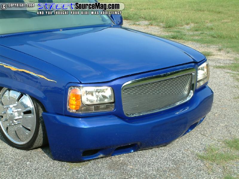 With the new stance the body would then need to be reworked to complete the over all exterior look. Starting upfront the stock hood, grille, headlights, fenders and bumper would all be replaced by a set of Escalade products for a newfound look.