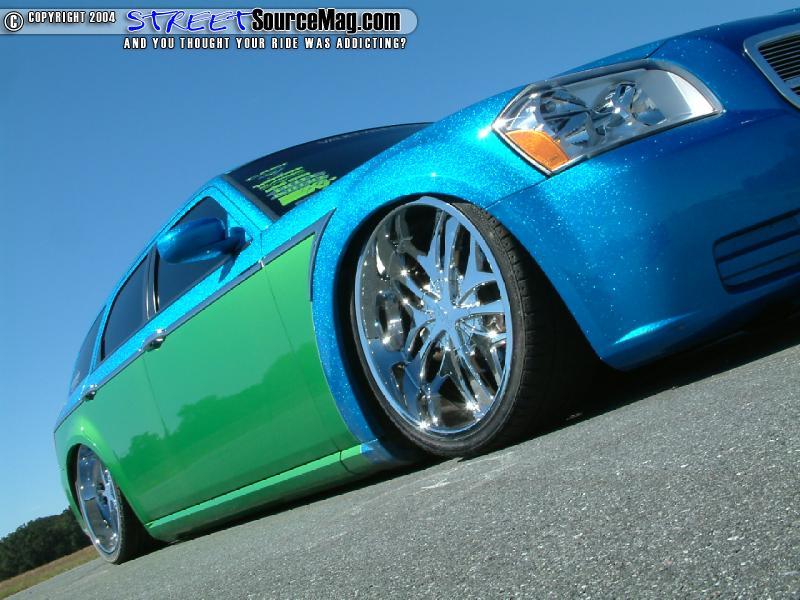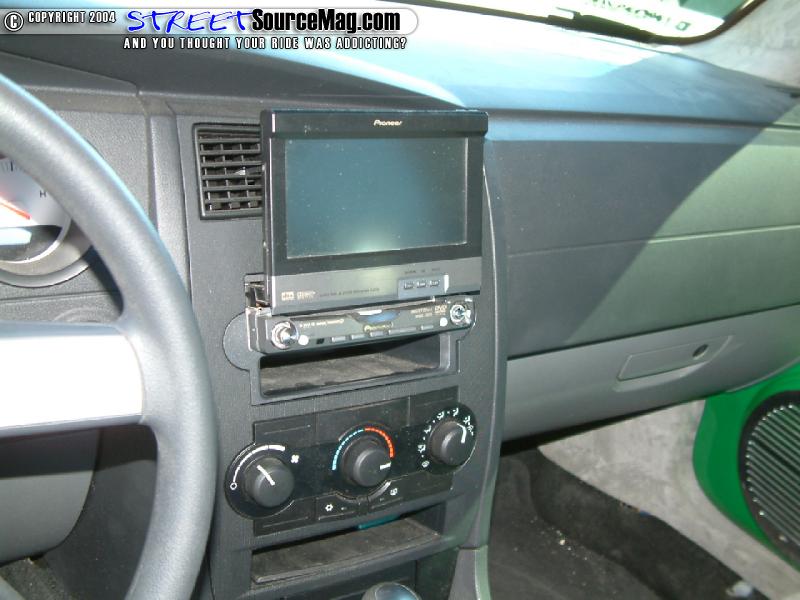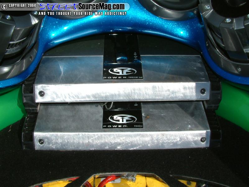 Next on the agenda for Kris would be a kick ass stereo set up. Keeping the same Pioneer in dash DVD/TV head unit in tact, Kris would build a new system around it. For starters 3 sets of Rockford Fosgate T162 components would be installed along with 4 Rockford Fosgate T1 10s. One Rockford Fosgate T2000.1bd is found pushing the subs while a Rockford Fosgate t800.4bd runs the mids and tweets. The use of a Rockford Fosgate 40 farad carbon capacitor,  2 optima yellow tops and all Fosgate wiring help keep the current flowing while 104sq feet of Rockford Fosgate dead skin through out the car help keep the sound in. The custom enclosure housing the subs would be a fiberglass enclosure also housing 3 18 inch blue LED tubs behind the amps and under the floor. Kris and Restricted Rick completed the entire Stereo install the night before SEMA.