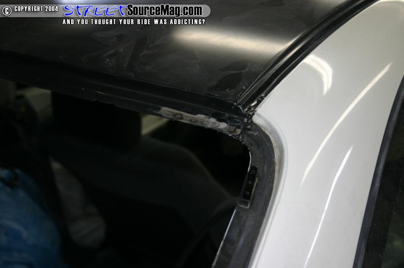 Lay the roof down where it needs to sit and make sure it is level. Next you will need to secure the roof to the car by using clamps. Do not make them super tight, just enough to see some glue start to squeeze out. Next pull out your welder or spot welder and spot weld the areas that you are able to.