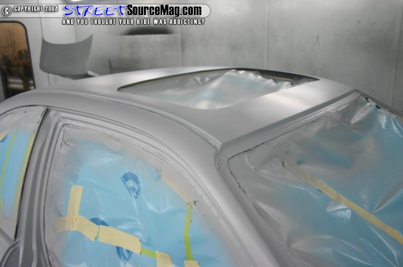 Next the car was pulled in the booth and taped up. After the car was prepped for sealer and paint I applied the seam sealer to the roof so that no water could leak in. After putting on my mask and mixing the paint I was ready to step into the booth. I first sprayed a few coats of Standox Sealer to the roof and let it dry. I then based out the roof with Dupont Taffeta white, and then cleared it with Dupont clear. The car was then baked. I wet sanded the roof with 2000 wet and buffed it so that it had a nice glass appearance. I then hand glazed my whole roof. The roof that I chose to use had factory sunroof in it. I reinstalled the sunroof, and attached the drain tunnels. I then called our friend Mike from Glasscar windows to reinstall the windows. After the windows were back in the car I put the interior back in and the car was now finished.