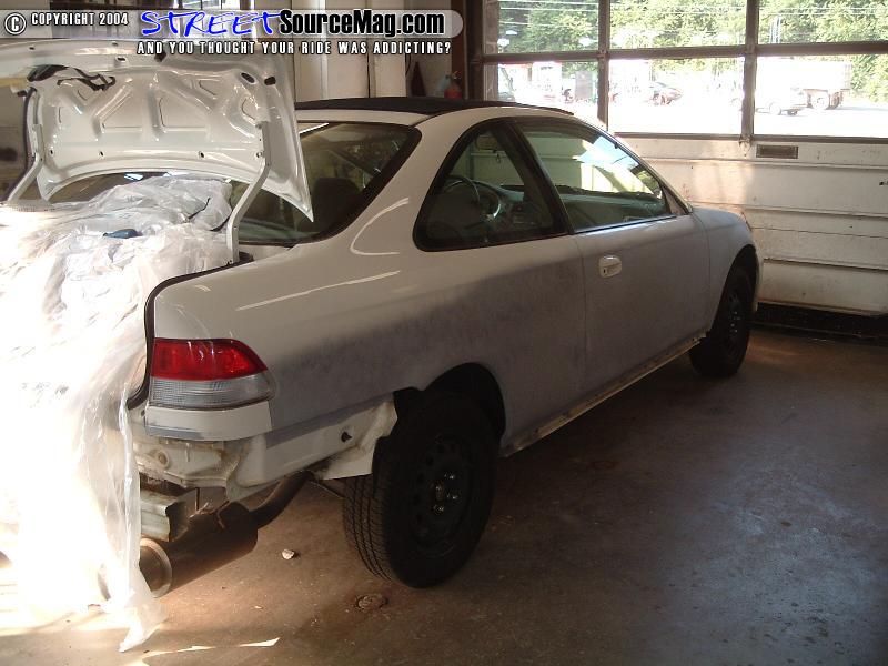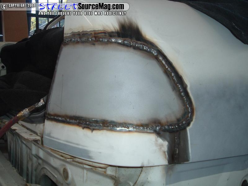I then sanded all the metal fillers down with some 320 and Weld Sealed all of them until I was ready to weld them in so that they didn’t get surface rust on them while they sat. Next I popped my trunk and removed both of the tail lights which were held in by 4 10mm bolts on each side. The lights were then removed and I fitted my fillers. The fillers fit pretty good they only needed some adjustments. We started out by welding in the lower filler plate. Once that was welded in we moved on to the actual tail light filler and molded that to the quarter.