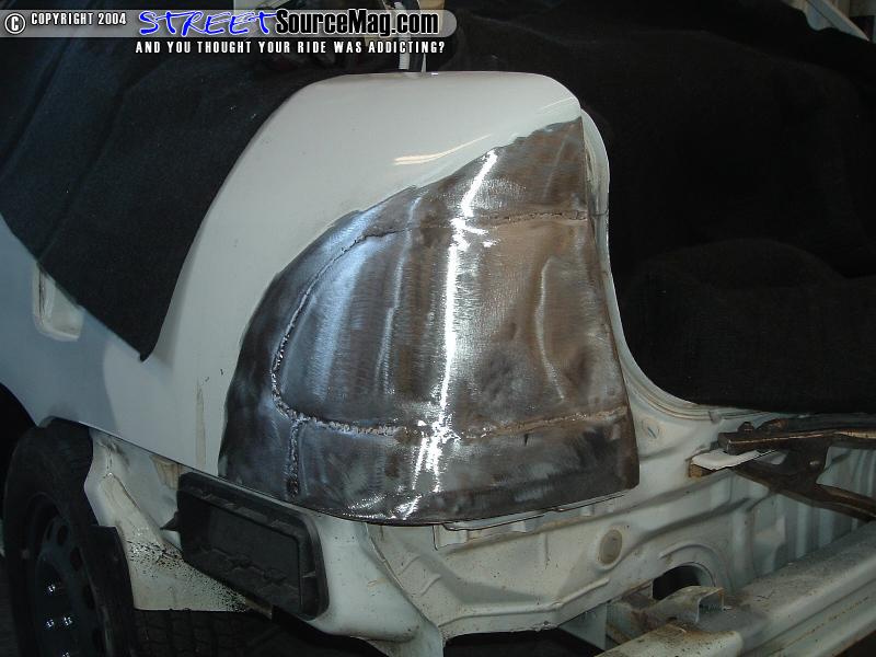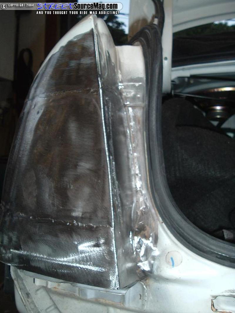 I trimmed off the metal that was not needed and then we fit the inner jamb filler piece. This piece fit near perfect and we welded that in. Next we moved on to the passenger side were we followed the same steps. After the fillers were all welded in I ground down all of the welds and we checked for pin holes and air pockets. We had to weld a bit more and ground down the welds until it was ready for some plastic work.