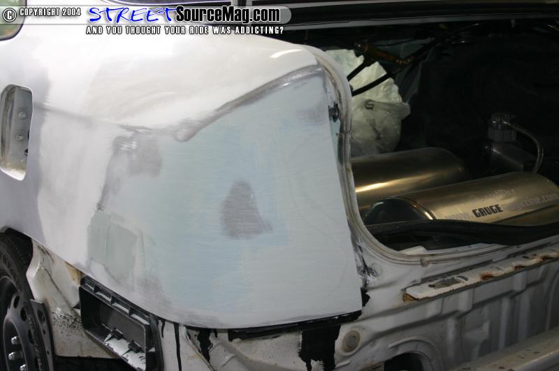 The bodywork soaked up the first time and I pulled it back in and blocked it again with 320. After I blocked it I tapped it up again and primed it with another 3 good coats of high build. I then sat the car in the sun again for about 3 days before I touched it again. This time the car didn’t soak up at all so I pulled the car in and blocked it out with 180 real quick, then 320 on a long board until it was nice and smooth. I then wet sanded the quarters, tail section, and inner jamb with 600 wet and the car was ready for paint.