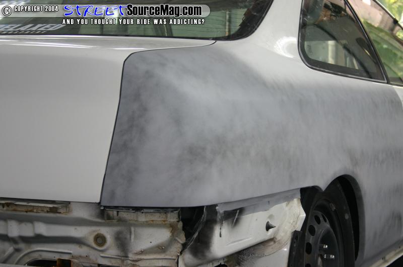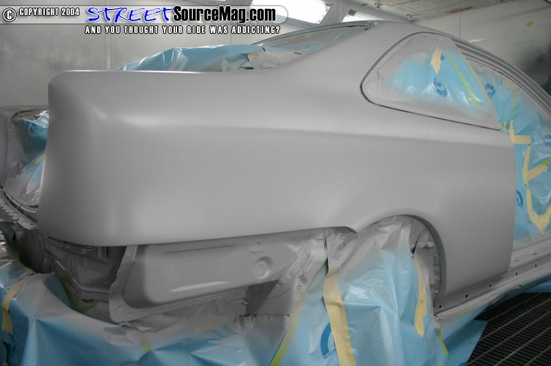 In the booth I sealed both quarters and tail sections. I then applied 3 good coats of base to each quarter section. Last I applied 2 good coats of clear to the quarters and then baked the car. I used all Dupont materials in the booth. When the car was done I pulled it out of the booth and left it over night. The next morning I wet sanded the whole quarter and tail section with 2000 wet and then buffed the whole quarter.