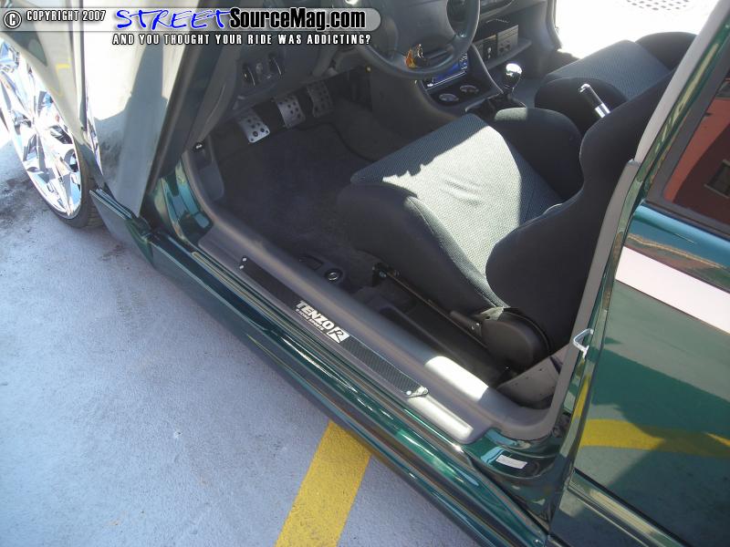 The custom work continues on into the interior. Black and gray Tenzo R racing seats were put in place of the boring stockers. The rear seat and doors were then upholstered to match and CIVIC embroidered into the backseat. Brad then installed a Panasonic CD player along with Audiobahn AW12002 subs and Pioneer mids and highs. Powering this setup is a 12001DT Audiobahn amp and Stinger battery.