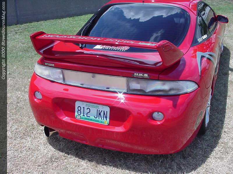 The body of Coby’s Eclipse was next on the agenda. First, Coby bolted on a VIS Racing carbon fiber hood. Next, an Erabuni GTR wing was put in place and APC clear bumper lights and APC clear taillights were installed. Next, Syndicate Graphix was called upon to create a set of black and silver tribal graphics to go over the stock radiant fire red paint.