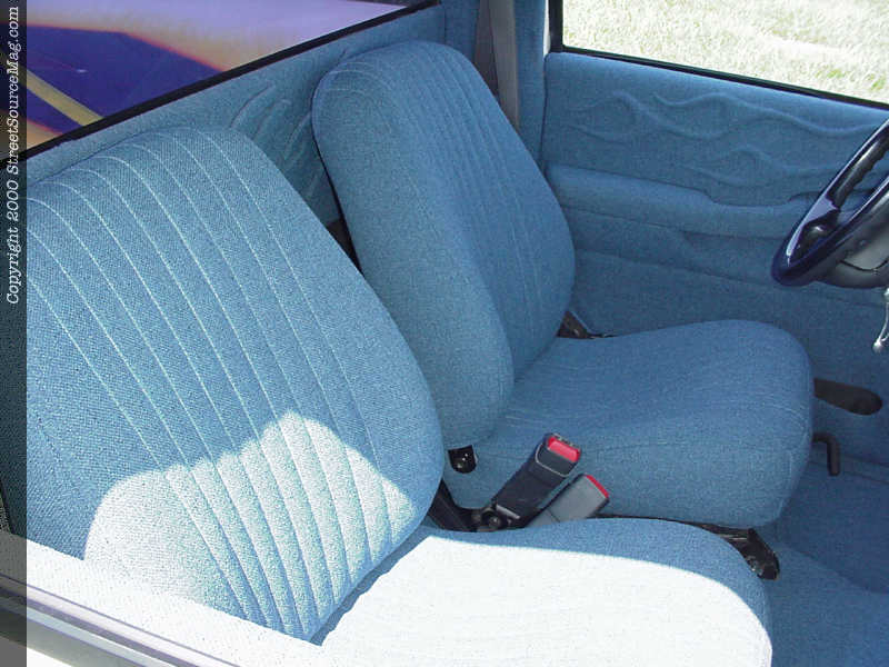 After the wild graphics were laid out, Easy Ed came in to add painted pin striping throughout the graphics. Other exterior features on Rob’s S-10 include blue headlight bulbs and clear corners. The taillights are also clear. With the graphics finally complete, Rob moved to his interior to give it a full show look. Jeff Hamilton removed the headrests and reshaped Rob’s ’97 Grand Am GT seats then covered them in Academy Blue tweed. Rob then covered the headliner and stock dash in the same color tweed and added many billet inserts for accent. Rob and Art Gordon have covered many other things in tweed. Next, Rob installed a custom stereo for sound while he’s cruising. Rob started everything off with a Pioneer graphical stereo and using MTX amp, gets the sounds throughout the cab using JL Audio speakers. Finishing off things, a Grant carbon fiber steering wheel was bolted up.