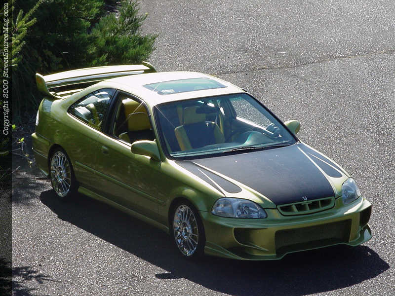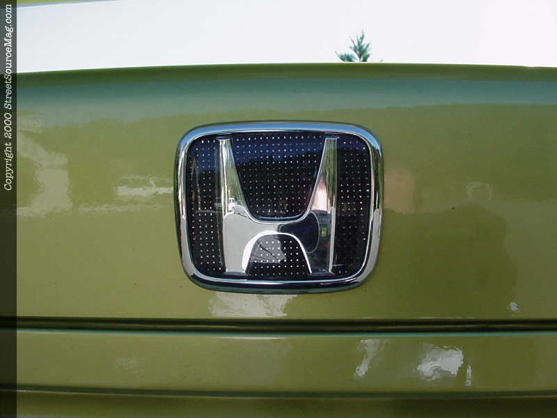 To bring this phat Civic to the eye grabbing attention it deserves, Angi turned to Justin Jones of Redding California to spray down the Sherman Williams electric metallic green paint. Angi’s husband Gabe lended a helping hand with the paintwork as well. While the car was with Justin, they decided to airbrush some ghost skulls into the scallops on the hood along with the door panels. To finish off the outer look Angi went with clear taillights and headlights.   | Even equipped with a Carbon Fiber emblem! | Now since the car was grabbing attention driving down the road, it was time to impress those taking a peak inside. Carbon Fiber inlay’s with custom paint are found within’ the interior along with a Momo steering wheel. The front and rear seats where covered in yellow and gray vinyl seats, which were done by Robs Upholstery in red bluff California.