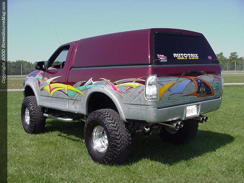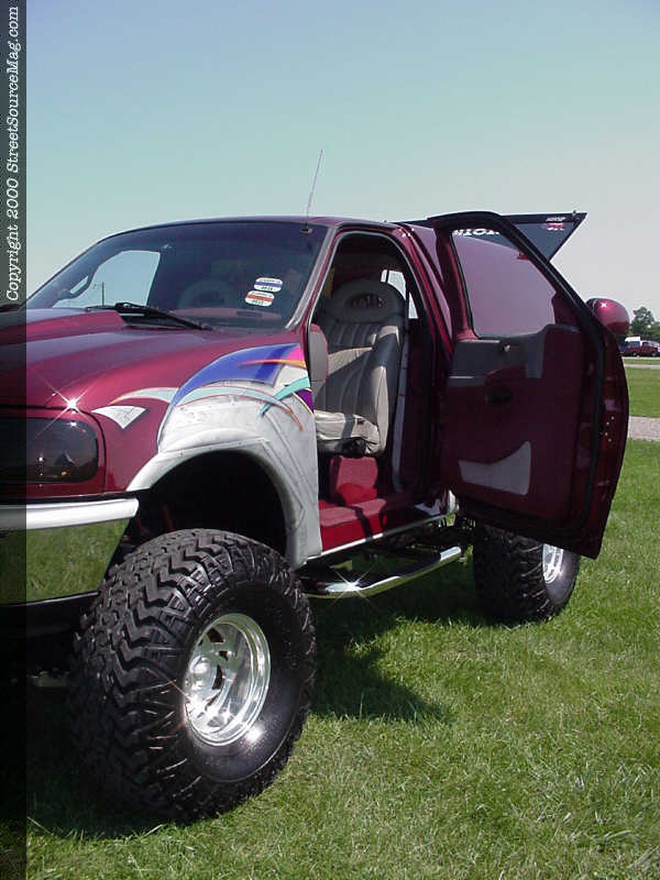 With his truck sitting higher than any other of the same model in his area, Jason knew he was going to need to make some major changes to the undercarriage in the looks department. So, with that in mind, Auto Trix went back to work First, they installed a new Snugtop the rear of Jason’s Ford. Next, suicide doors were on the agenda and the undercarriage was disassembled and everything treated to paint or chrome for added show points.  Finishing things off, Auto Trix installed a TV/VCR combo in the cab of Jason’s Ford and an Aquarium back window (sorry, no fish!).