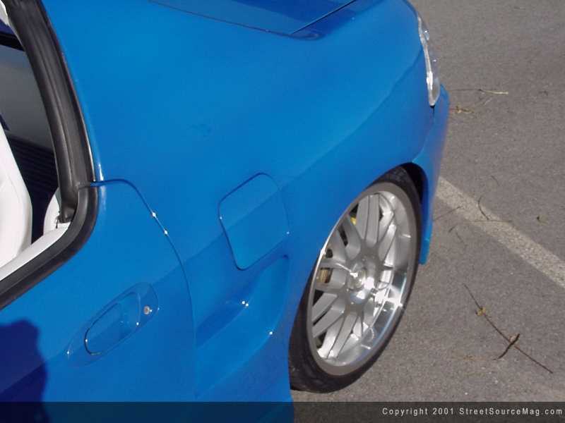 With the newfound body sporting the aerodynamic look, Donald would need to give the Del Sol suspension a whole new structure to allow performance on all levels to be complete. Feeling that the need not to drag the kit on the ground whether it going in and out of parking lots to hitting bumps in the road, Donald was looking for an alter suspension he would feel comfortable with. To put these concerns at ease, a complete set of Blow Jacks air ride system would be installed for much needed lift on the go. Before installing the new suspension mounts and pieces, much of it would be powder coated by Cararra Industries of Anderson, IN. Now that the new air suspension was in place, it was time to prepare for performance whether it would be on the strip or street. To help keep a level plain while entering and leaving corners at high speeds, a set of Jamex upper front and rear strut bars would be mounted along with a Neuspeed lower strut brace. Ensuring that all performance was smooth with the corners and bumps, the use of Energy Suspension bushings would be needed.