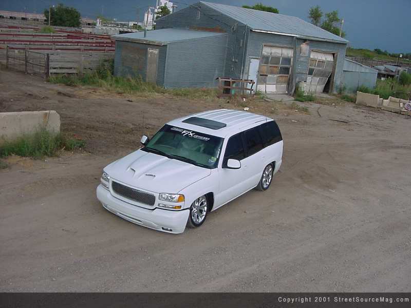 With the grill now taken care of, something still didn't look right for this Yukon so Craig decided to have the front bumper painted to match and shaved the tow hook holes. The headlights from a Denali where installed to help bring the front of this beast to the way you see it today. Out back Craig and the guys at F/X junked the bumper for a steal roll pan and a custom built hidden hitch to pull the toys around with. As for exterior paint Craig kept it pretty much stock except for painting the door pillars black bringing out the all glass appearance.