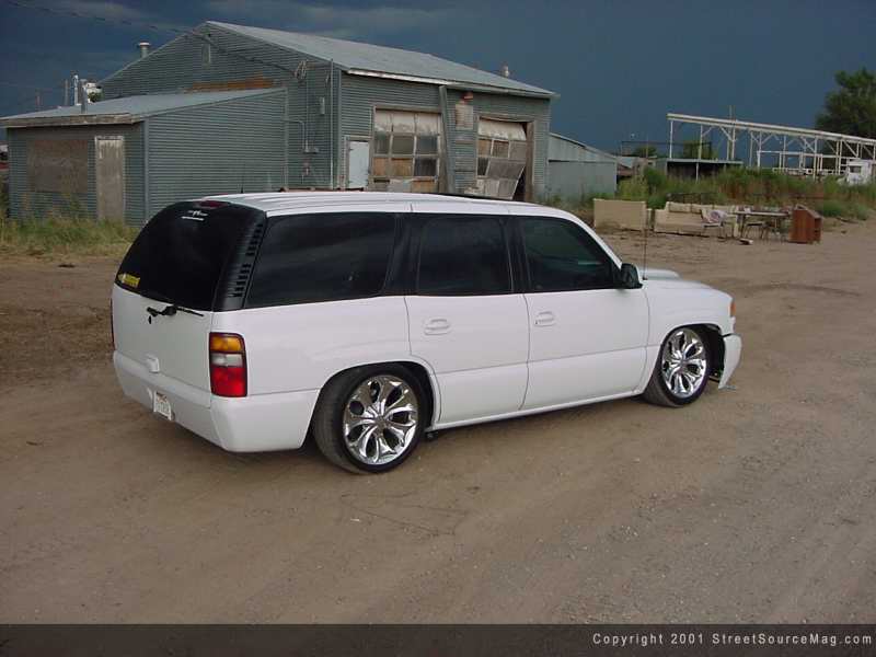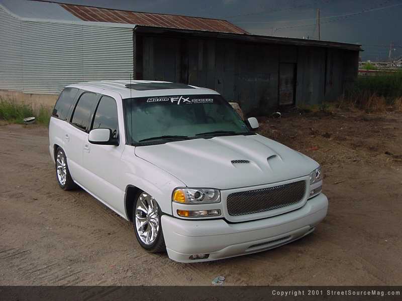 As for suspension the guys at F/X really took care of Craig. First off F/X ripped out the front coil springs along with the shocks and replaced them with firestone airbags. To help smooth out the ride, a set of ground force shocks where relocated. Moving to the rear F/X modified the factory 4-link and installed 2 firestone airbags to give the Yukon a tough laid out stance when deflated. To get this beast up and down F/X installed Grainger valves, 1/3 horsepower compressor and two 5-gallon air tanks all hidden well underneath the SUV.