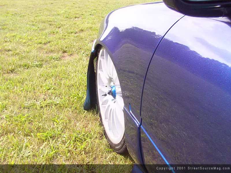 After all the shaving was done and the body was smoothed out, it was time to drastically change the front of the car. To achieve this, Terence bought a VIS Racing front bumper. Since they didn't make one for his Corolla, the bumper of choice was one designed for a Honda Civic. In order to make the bumper fit, it had to be sectioned and have about 2 inches removed from the center. Once the bumper was put back together a billet grill was installed to fill the center hole. The other three pieces of the body kit are from Erebuni and were actually designed for a Corolla. Now that Terence was happy with the body of the car, it was time to pick a color that would make all the bodywork stand out and one that would make you take a second look when you passed it. He couldn't decide on just one color so he chose the color changing Aqua Purpleen shade of Dupont Chromalusion.