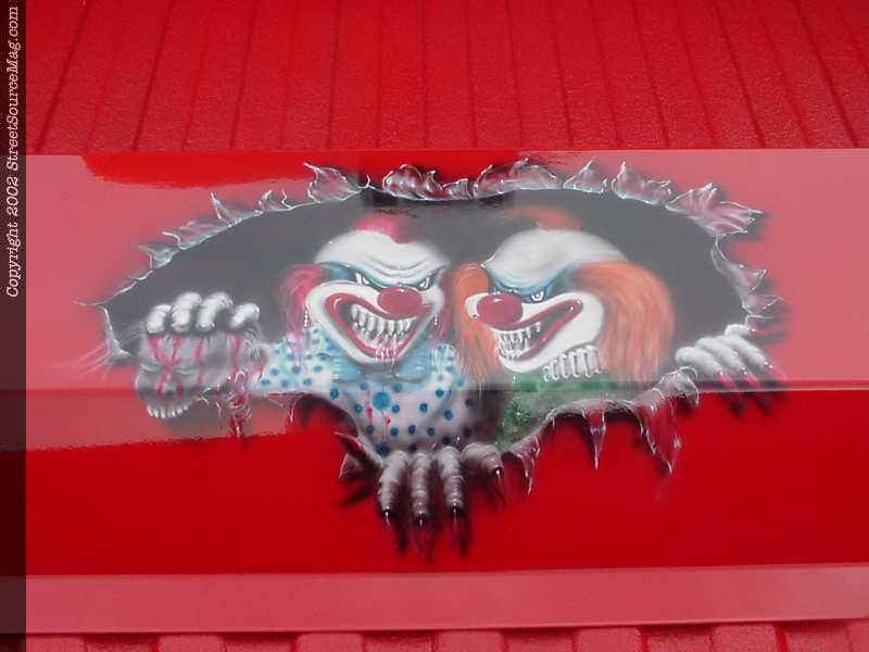 After the bodywork was complete, the Chevy was painted a PPG Indescrot Red painted by Rusty Cox of Dusty's Collision. For an added touch, Jimmy then had Bob Watkins air brush some Killer Clown murals to help add some life to the single color paint.  It would now be time to hit up the interior. First to get new treatment would be the dashboard, which would be painted red along with wrapping the door panels and headliner in ultra tan leather.