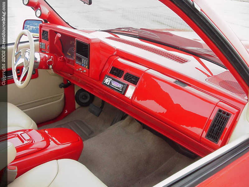 All other interior panels where painted red to match the dash and to bring everything together. Wanting new seats, Jimmy would install a set out of a 1998 Tahoe. The seats would be installed and reupholstered in the same ultra tan leather along with the head rests being removed. The seats where stitched up by Tracey Morris of Pocola, OK. The stock steering wheel was then replaced with one that was supplied by Budnik to help finish things out.