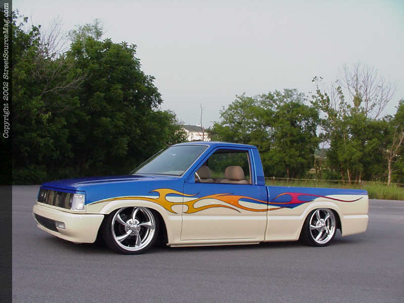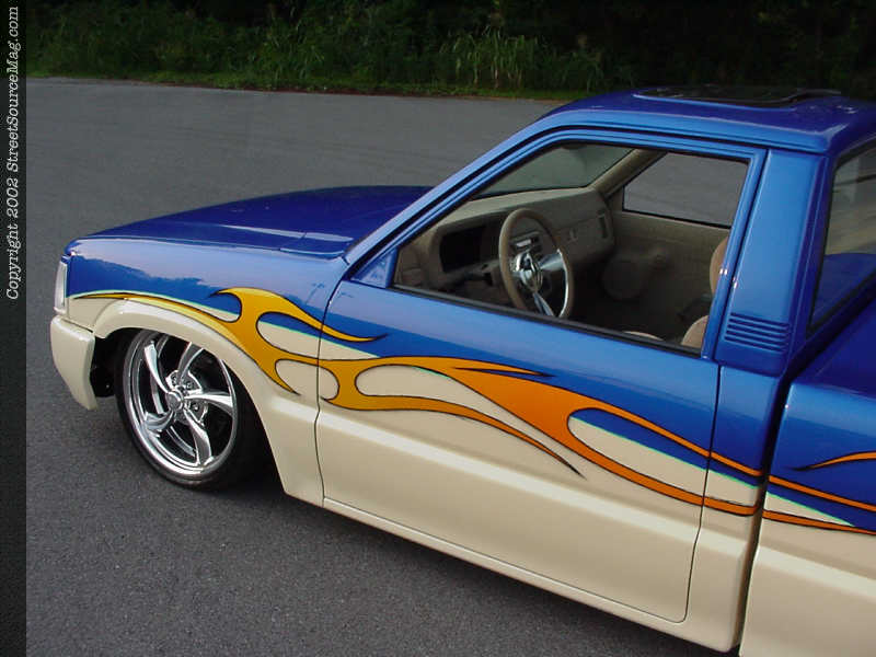 As with any custom vehicle, the suspension had to be altered to fit the owner's tastes. Andrew's Mazda needed to be sitting just a tad lower than stock height so the necessary steps were taken to achieve this. Up front, Andrew installed drop spindles from AIM Industries to drop the Mazda's nose a few inches closer to the pavement. This wasn't enough, so Andrew took the time to fit Firestone airbags up front as well. In the rear, a notch was performed between the frame rails for the much needed travel, along with a custom 4-link and Firestone airbags. Before everything could be put back together, the frame was also also base coated and clear coated for a nice, clean look. Nitro drop shocks were installed at all four corner to insure a smooth ride. Adjustability comes in the form of 1/4" manual valves.