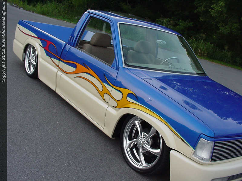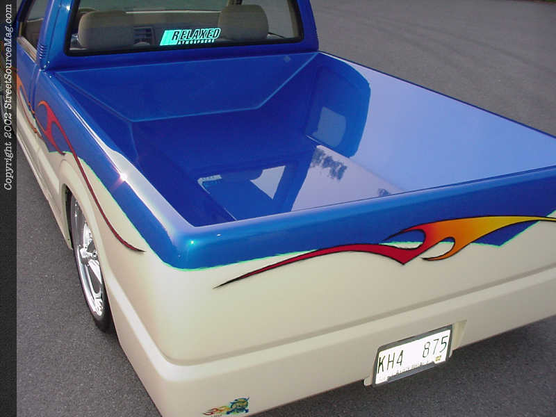 With everything shaved and smoothed to Andrew's tastes, he delivered his truck to Denny Phillips of Meridian, Mississippi for color. Denny first applied the House Of Kolor Trublue and cream two-tone, then gave the Mazda more life with House Of Kolor Magenta Pearl and Sunrise Pearls flames. Denny the used a shade of green to pinstripe and bring life into the color scheme. Generous amounts of clear were then sprayed and Andrew's Mazda was finally starting to take shape.