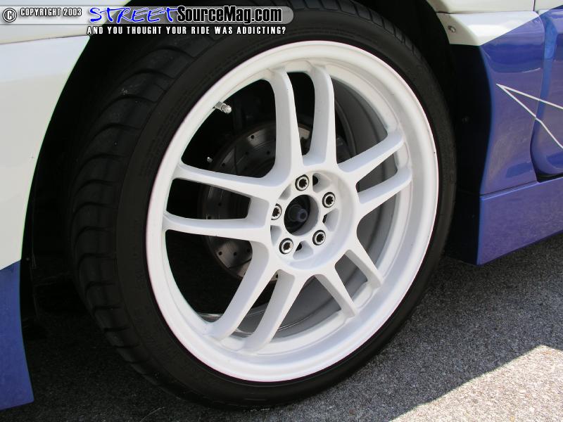 Now that the body was in righteous order it was time to shift focus and tackle the next task at hand. Eibach springs were installed on all four corners to bring the altitude of the entire car down two inches closer to Mother-Earth.  KYB Struts were then installed to smooth out the rough LA roads. High Rev Motorsports was then called upon to supply one of their upper strut bars to tie the front end together under hard cornering conditions. Now with the car sitting were it belonged it was time to replace the factory no frills wheels with some Racing Hart CP-035 18" white wheels shod in a 225/40/18 Sumitomo skins.