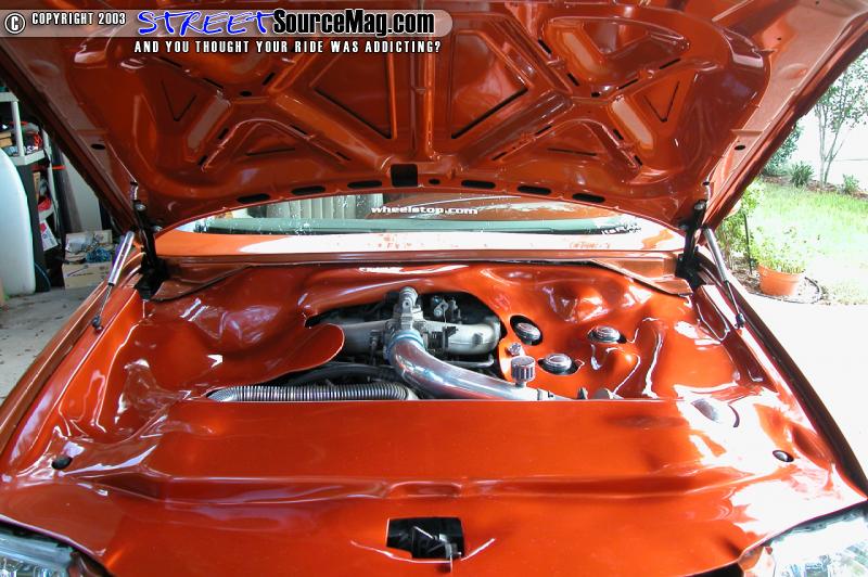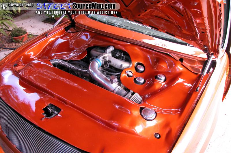 Needing only the engine work done to finish this complete custom up, David would add more eye candy then anything else. First off an Electric cooling fan would be installed for those warm summer days. Next you will find a 140-amp alternator holding the current steady.   You will also find a custom fiberglass molded cover by RAW along with all billet caps and custom dipstick by Billet & Acrylic Fantasies. Giving out a little more horse, a 3-inch exhaust with Bassani muffler would be installed while a modified civic intake would be installed.