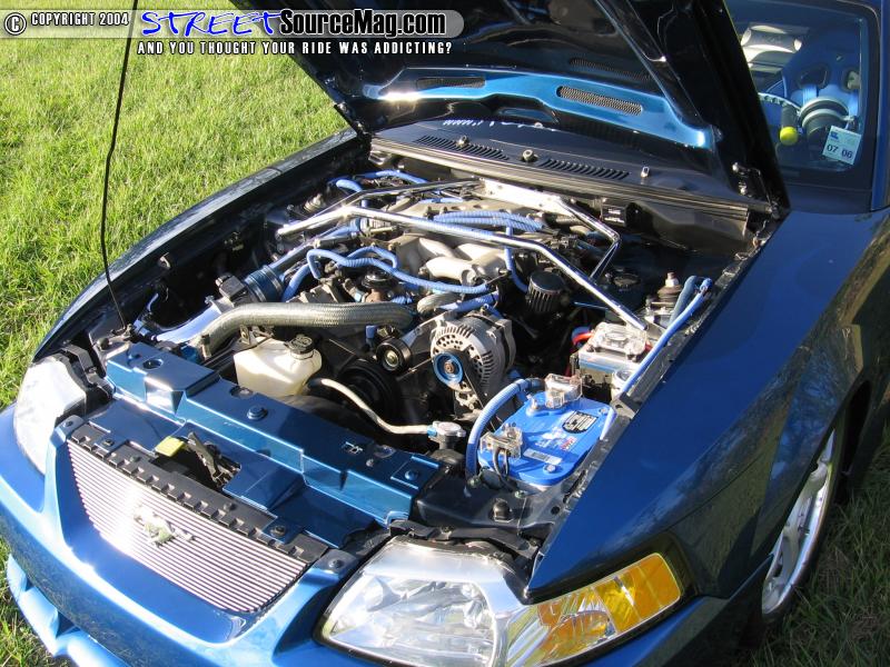 The engine would remain mostly a stock V6. To bring the custom work through out, a BBK chrome intake, BBK chrome strut brace, Optima blue top battery along with many other painted pieces and billet dress ups through out.