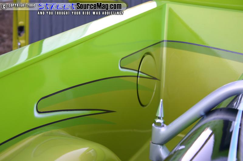 Moving on to the bed the tailgate was molded in along with the roll pan, and the gas door was shaved and relocated into the bed. Underneath the body of the truck lies a fully shaved, boxed and painted frame. This one of a kind frame was built sturdy to work with the full air ride suspension. Marks air ride setup consists of a lot of chrome, crazy mounts, DJM spindles, custom-built chrome 3 link, and air bags all around.
