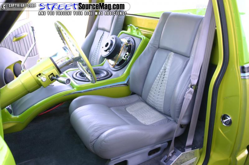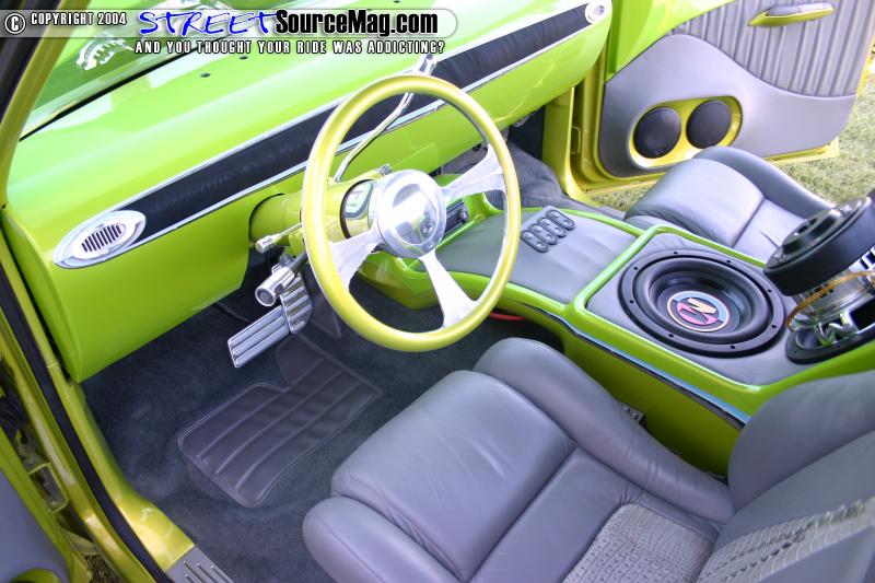 The seats are out of a Fiero and are wrapped in gray gator and leather. Coachworks did all the wrapping. Marks interior also features a Billet Specialties steering wheel, Trenz billet mirror, bullet hot rod vents, and a custom fiberglass console housing the switches and amp. The stereo consists of a Pioneer head unit, Boston Acoustics mids and highs, two 10” Memphis Audio M3 subs, and a Soundstream class D amp.