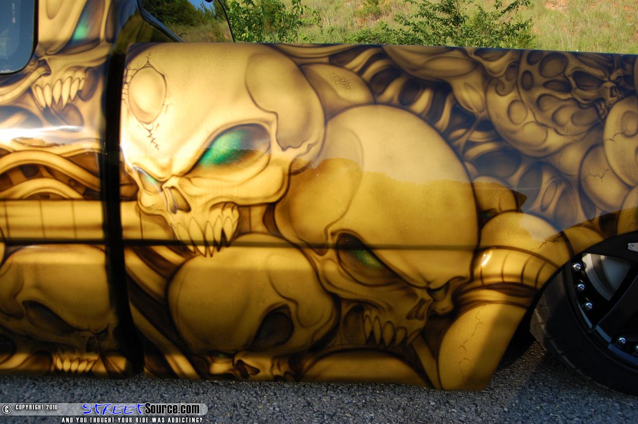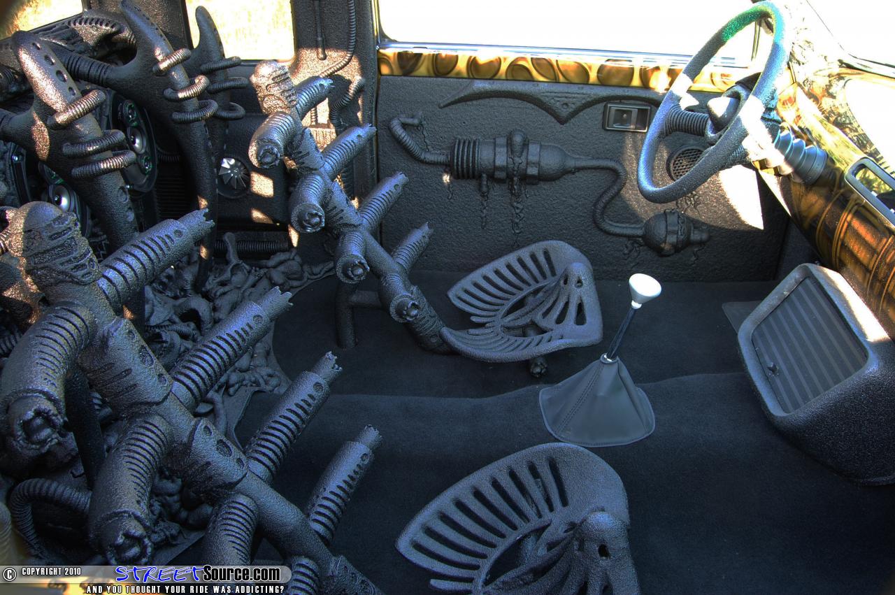 When it comes to setting your sights on the cover, your paint job really has to grab some attention. With this as his goal, Kyle set out to blow everyone away. Before the paint hit the truck, another crew of tight-lipped friends were assembled. Starting out with a Toyota 4Runner front end, Kyle and his friends Steve Faston & Josh Zumwalt proceeded to shave everything they could, even rounding the bed corners to be as clean as possible. A hole for a 40x40 rag top was cut and then it was time for some paint. The base coat and clear were handled by Jon Wiggins of Creative Classics. The airbrush was wielded by Jonie Nichals also from Harrisonville, MO. You can see this truck several times and still catch something in the paint you missed every other time you looked at it. The interior of this wicked truck was the brainchild of Kyle himself. Wanting something truly evil looking, Kyle built a fully one-off interior using rolled steel and whatever could be found and integrated them into the theme. Once the fabrication was done, nearly everything was covered in spray on bedliner from Ameriguard. The dash features Dakota Digital gauges so Kyle can keep tabs on his speed and everything else. What would an evil truck be with a factory four-cylinder motor? NOT EVIL. With that in mind, Kyle shoved a Chevrolet 350 engine under the hood complete with a mild cam, Holley high rise intake and Edelbrock 600 carburetor. Joey Bails handled modifying the 700r4 transmission that keeps Kyle cruising this truck down the highway. Kyle would like to thank Guilty By Design, Tim's Muffler, Ameriguard of Lee Summit, Creative Classics, Robert's Tire, Solor Pro, Clint's Alignment, Bob Sipes, Josh Zumwalt, lil Kyle, Jon Knap, Leon Bearce, Jon Wiggins, Jonie Nichals, Steve Faston, Jamie Taylor, Pig, CJ, Henry at Automotive Again, Shawn Yoss, Mike Baker, Fake Uncle Doc, Dale & Evlyn for the garage space, Mom & Dad, wife and daughter as well as anyone else he forgot but answered their phone when help was needed.