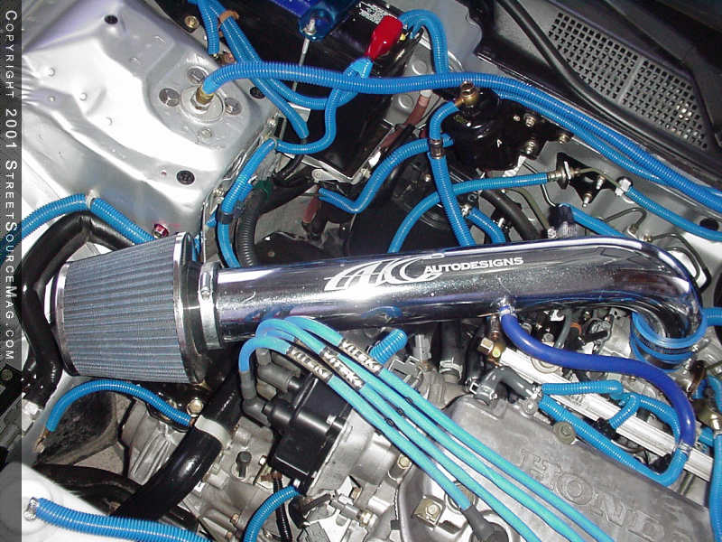 One of the first mods that he would encounter would be a brake impulse set up to adjust the speed of his lights. Now knowing that there were many things that needed to be accomplished, the next step would be to allow the engine to breath to help give added performance. So to change things up, an AC Auto-Designs intake was installed to bring power along with some eye candy under the hood. Along with the intake, a Tanabe 6 Medallion exhaust with muffler, and a Kamikaze 4 to 1 header were installed to help the engine breath.