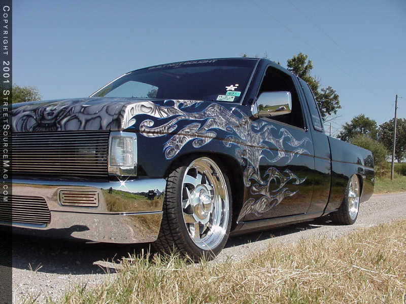 One of the first steps Brian had in mind for his mini would be to lay the stance down to huge mother earth. In order to accomplish this feat Brian would need to turn to Sean Thurman of Lewisville TX for help. While in Sean’s hands, the rear frame was notched and a custom 4-link was made and installed. To get everything to lay smoothly to the ground, Sean also constructed tubular cross-members throughout to replace the stock bulky ones. The next step would be to install a set of Doestech shocks up front along with bagging all four-corners for adjustability on the fly. Brian’s decision to work the body would be one of strategic planning. To give the ’92 Hardbody a newer look, Brian decided to bolt up a ’96 hood along with a set of ’96 pathfinder fenders.