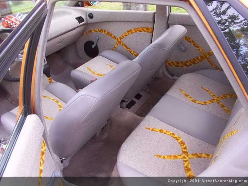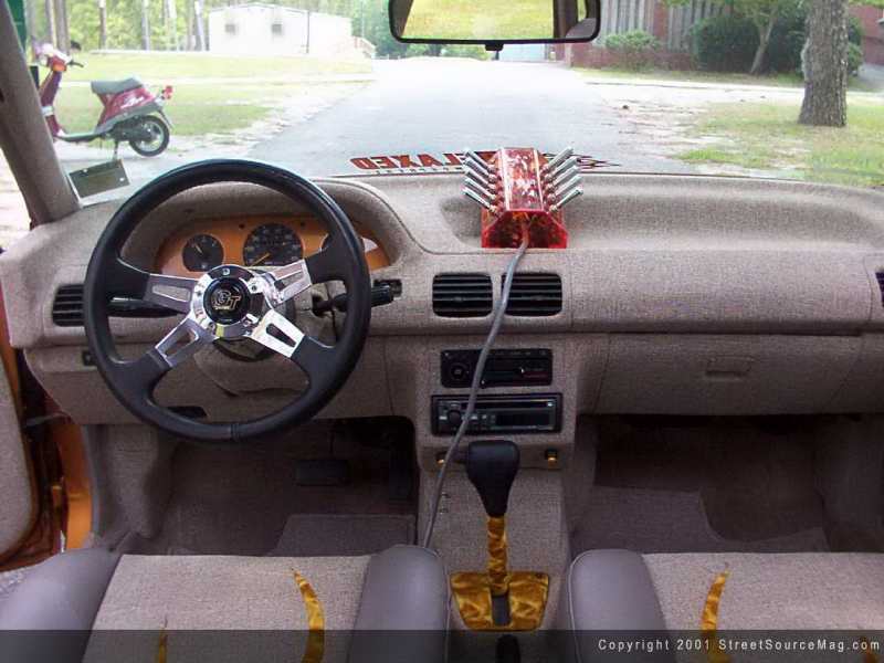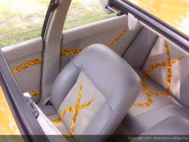 Now that the exterior and engine of Tommy's Escort are as smooth as possible, it was time to build an interior that would round out the total package. After showing for a couple years with the factory interior with some gray tweed pieces, it was time to change the look all together. All of the factory panels were pulled out and stripped so the new interior color could be added, this time Tommy chose to go with tan. Every thing from the headliner to the dash was wrapped using tan tweed.